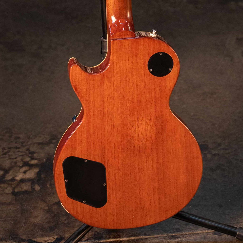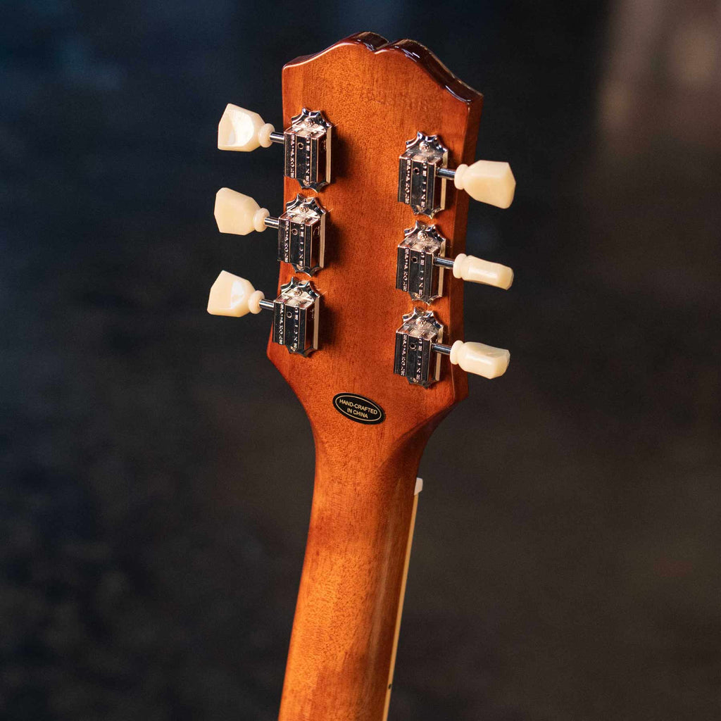 This guitar is crafted with a mahogany body, maple cap, a bound '59 rounded medium C shaped mahogany neck with long neck tenon, laurel fretboard with classic trapezoid inlays and 22 medium jumbo frets. Epiphone's vintage deluxe tuners, a pair of critically acclaimed Epiphone Probucker™ humbuckers™ and gold top hat knobs with dial pointers. This Epiphone Inspired by Gibson original model also has the Kalamazoo headstock, Graph tech® nut, era-appropriate wiring and CTS® pots. A premium gigbag is also included.