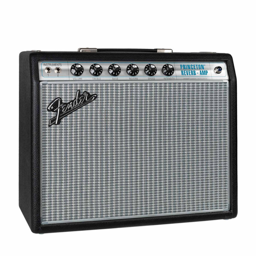 The guitarist with an eye and ear for late-'60s Fender silver panel style will love the '68 Custom Princeton Reverb, which honuors the classic look and great sound of that era's amps. Small, light and moderately powered, longtime recording and gigging favourite the Princeton Reverb received a fresh new face in 1968—a silver-and-turquoise front panel with aluminum grille cloth trim, with tone, reverb and tremolo that was still pure Fender.