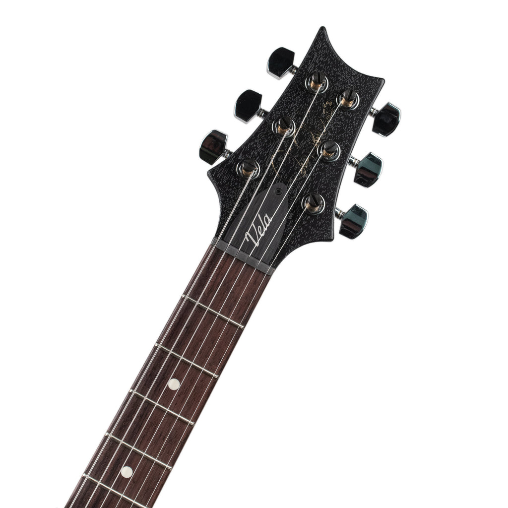 Its pickguard-loaded electronics feature a PRS DS-01 pickup in the bridge, providing a bright, punky tone and the PRS-Designed Type-D Single-Coil in the neck that gives the Vela some noteworthy bite. The coil-tap on the tone control allows the bridge pickup to split to single coils, providing a balanced tone that will cut through the mix with style. Anchoring this guitar is the PRS plate-style bridge with two saddles that were designed to compensate for intonation. This bridge harkens back to Paul’s early designs and traditional bass plate-style bridges but is top-loading for easy restringing. Like the bridge found on Paul’s Guitar and some Private Stock models, PRS’s plate-style bridge features brass saddles and an aluminum plate for maximum tonal sustain.