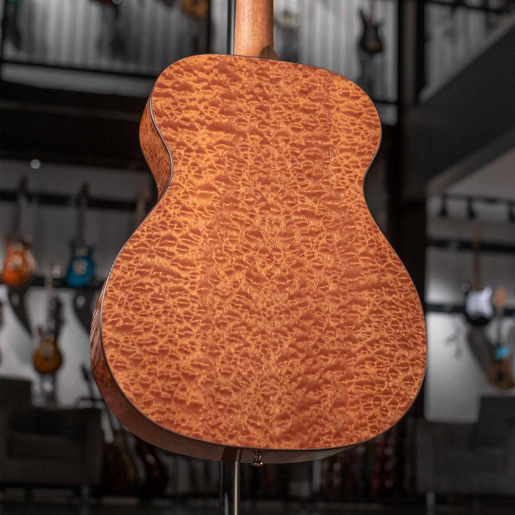 The 5A figured sapele is tremendously 3D and really dances in the light. The top is Master Grade Adirondack Red Spruce and aboslutely fills the room with sound. Loud and clear with incredible projection. This turned every head in the store when we opened the case and took the first strum.