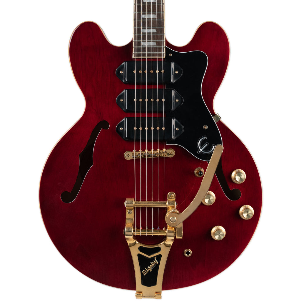 The Epiphone Riviera Custom P93 is modeled after one of Epiphone’s most enduring classics, the Riviera and features three P-90 pickups, gold hardware, and a Bigsby B700.