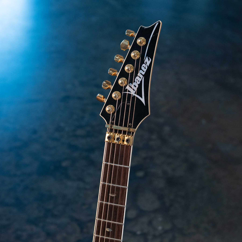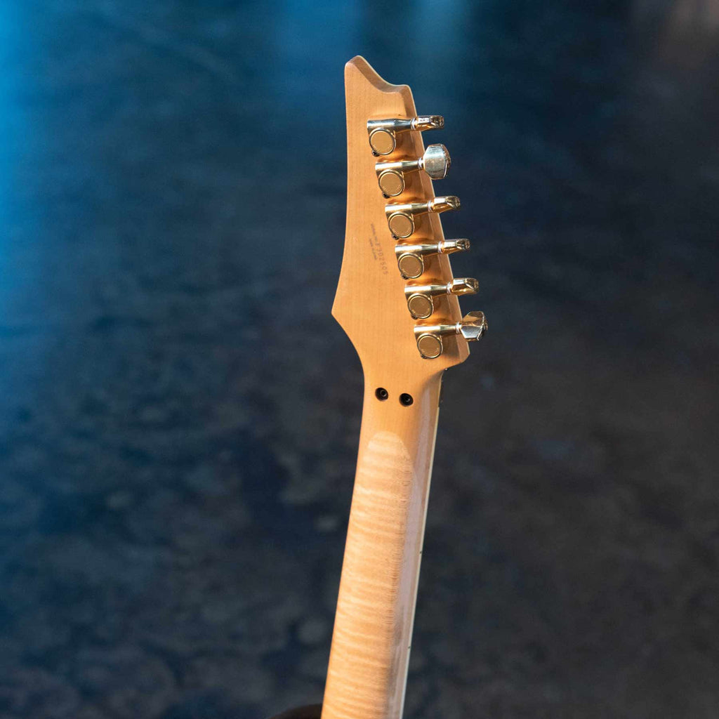 The S540BM features a burl mahogany top and back on a mahogany body bolted to a maple neck with a 22-fret rosewood fingerboard with binding and oval position markers. Components include a Lo-Pro Edge double locking tremolo bridge, a locking nut, Gotoh tuning machines and Ibanez pickups with a pair of humbuckers flanking a single-coil