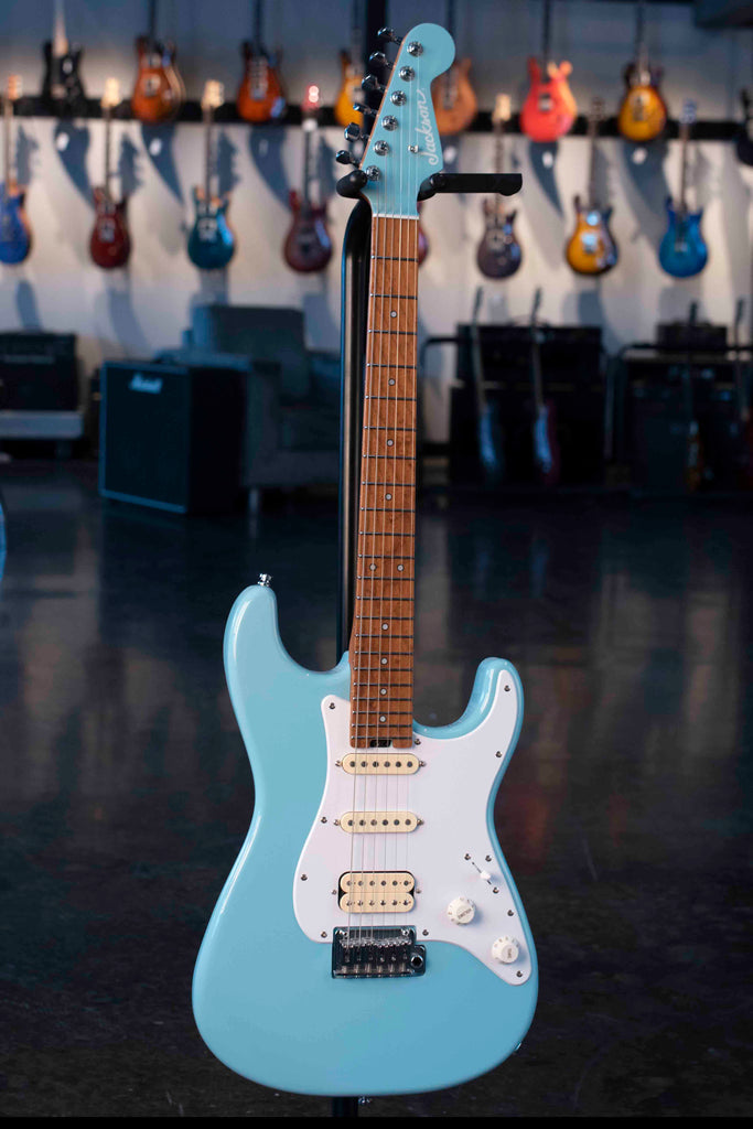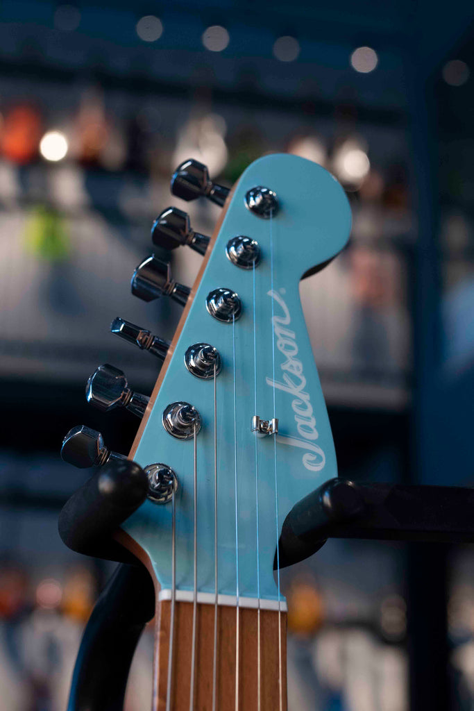 A classic beauty, the MJ Series Signature Misha Mansoor So-Cal 2PT comes in Daphne Blue with color matched licensed Fender® Strat® headstock, white pickguard, parchment skirt-style control knobs and chrome hardware.