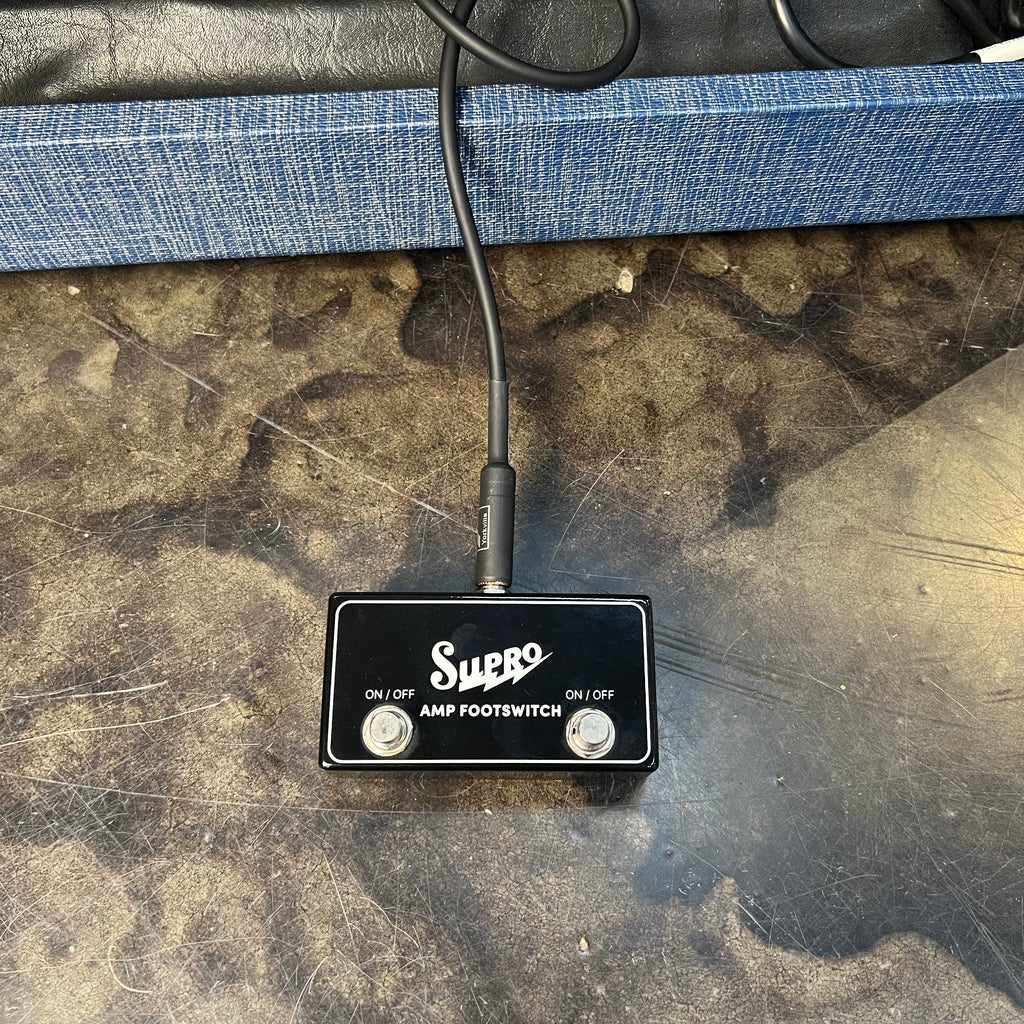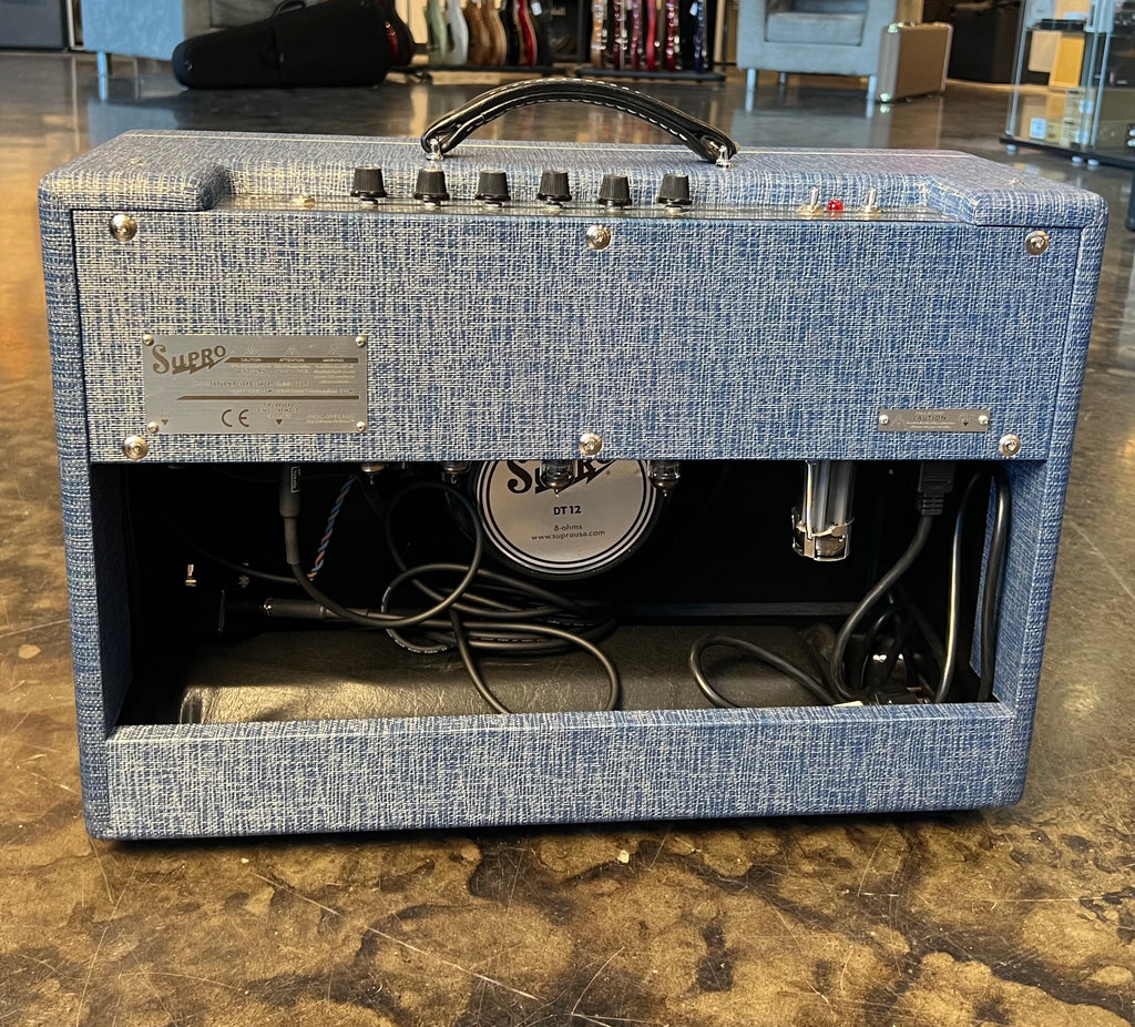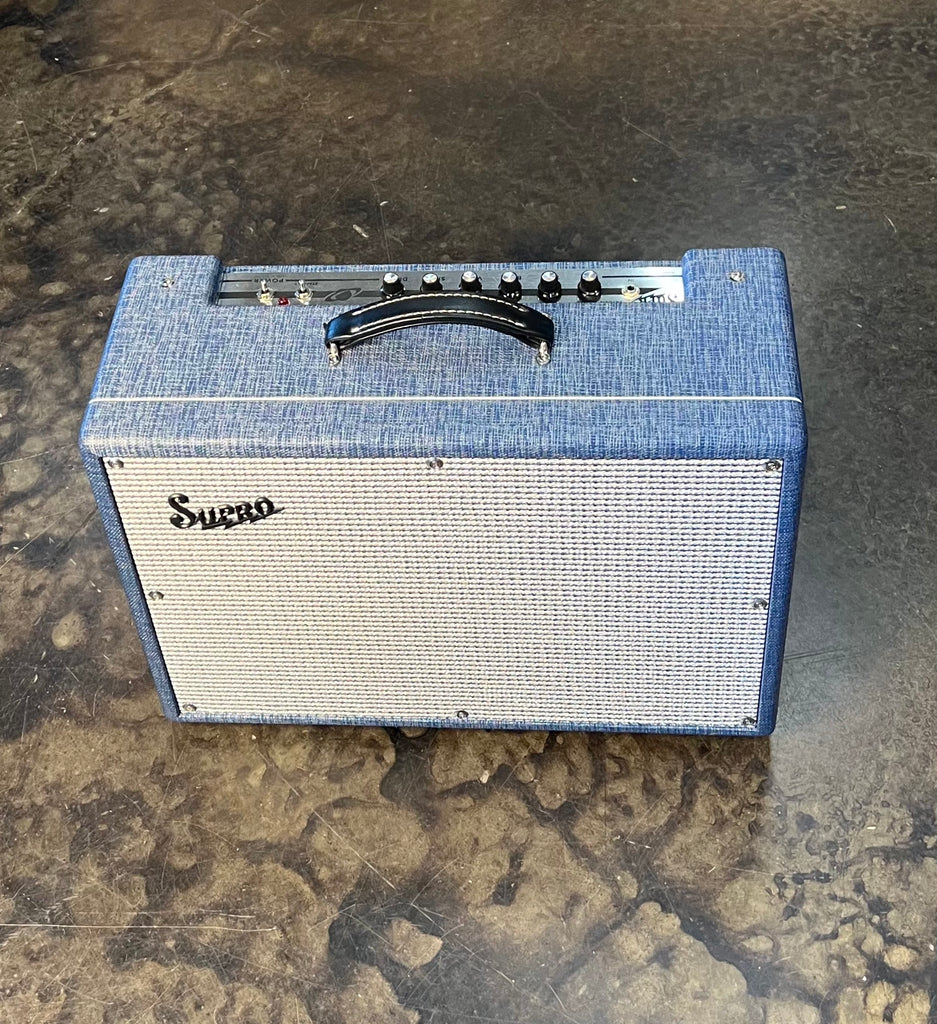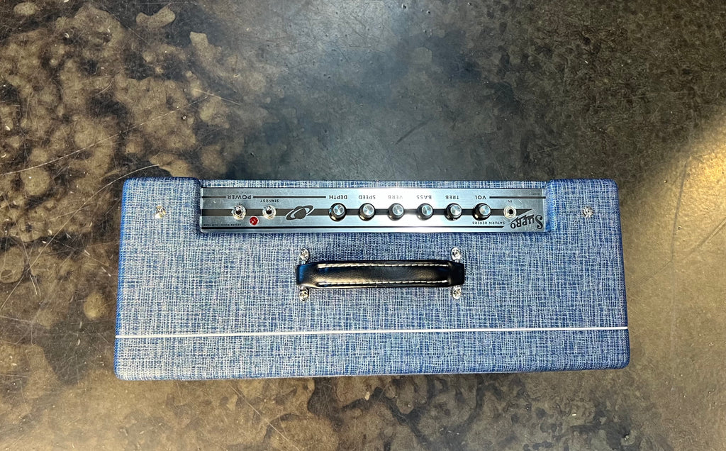 The Saturn Reverb’s blue rhino hide tolex, vintage-correct cabinetry and fundamental circuit topology are all drawn from the original Supro Reverb combos of the mid 60’s. Like its ancestors, the new Saturn Reverb’s power-tube tremolo comes after the reverb pan, lending an ethereal shake and wobble to the enveloping wash of tube-driven spring reverb. The Supro Saturn Reverb’s 3-spring, 8” long reverb pan and all-tube reverb drive and recovery stages provide warm and smooth ‘verb that “surrounds the note” without getting in the way, even when the amplifier is cranked all the way up for maximum grind.