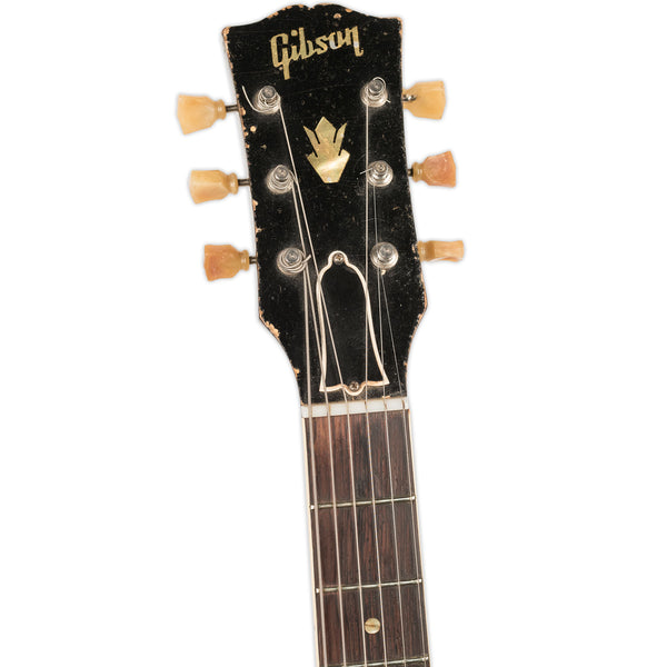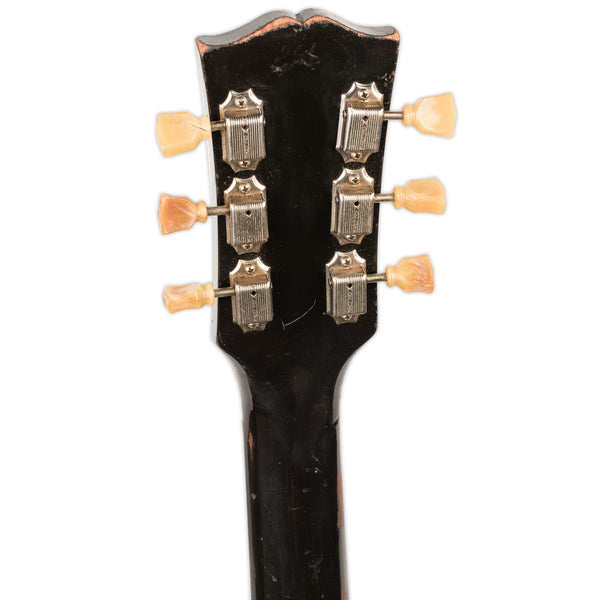 The machine heads have yellowed considerably and a couple have shrunk, which is standard for 50's Gibsons. We have put repro heads on and have included the originals in the case.